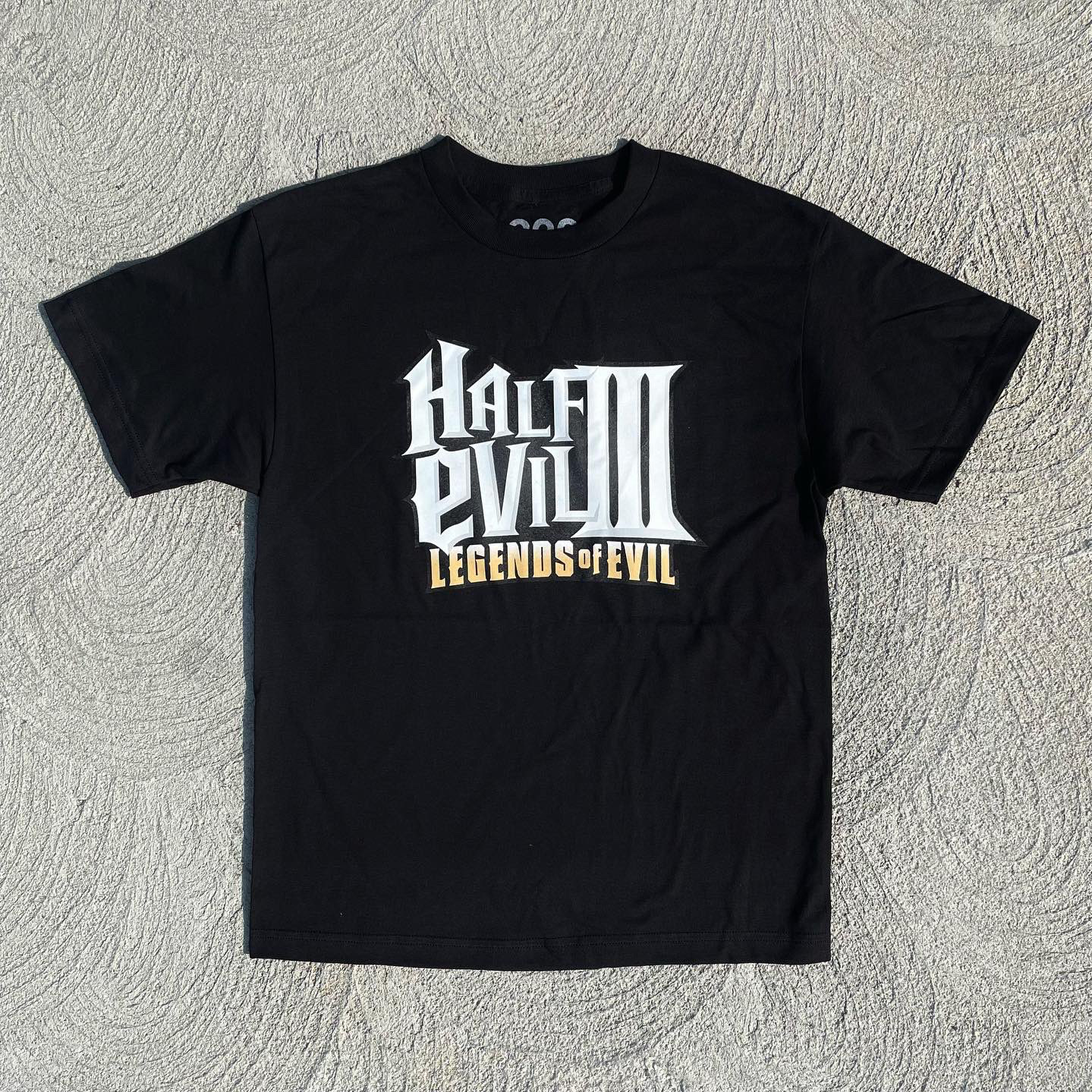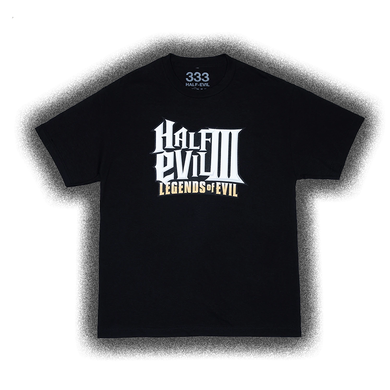 Legends of Evil graphic on black t-shirt, front center placement.
