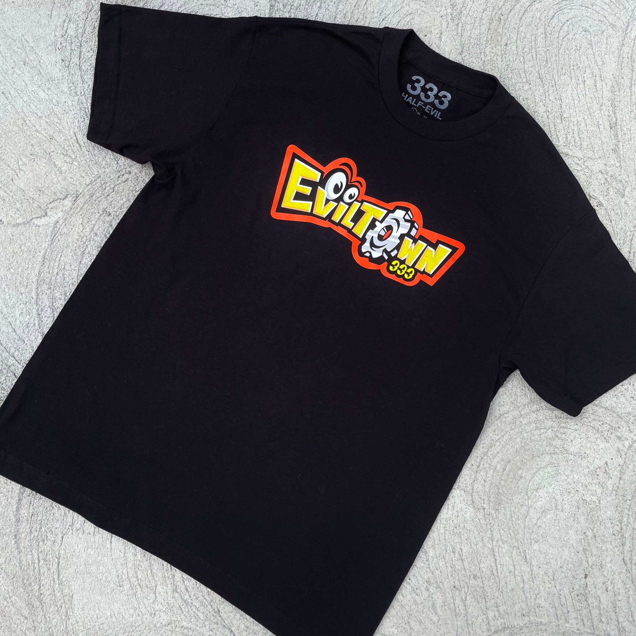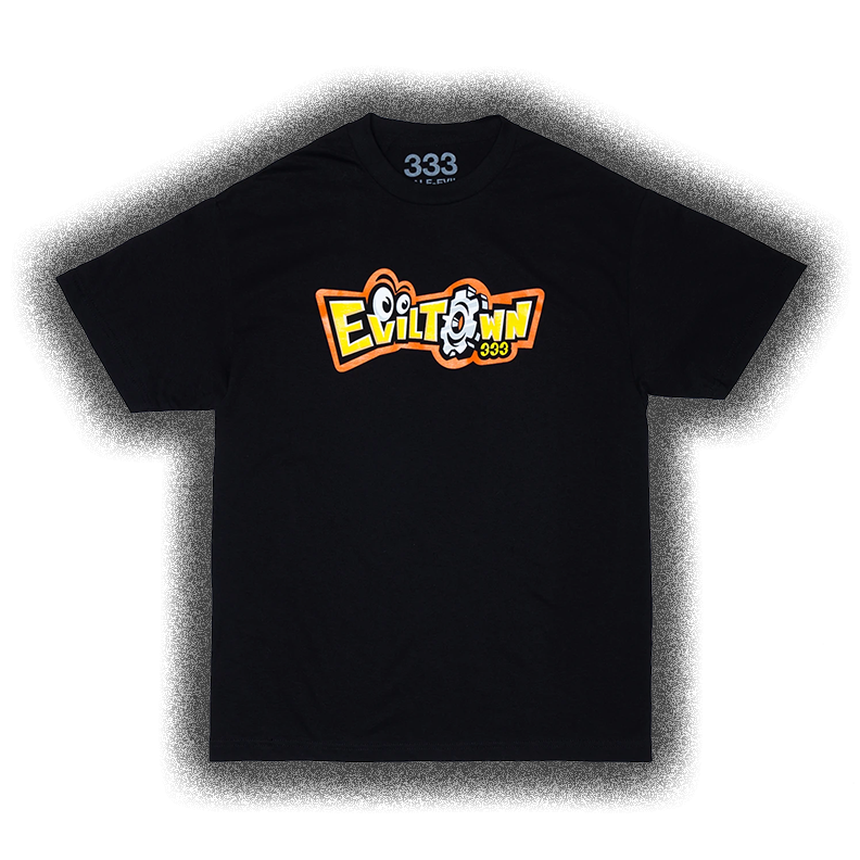 Eviltown graphic on black t-shirt, front center placement.